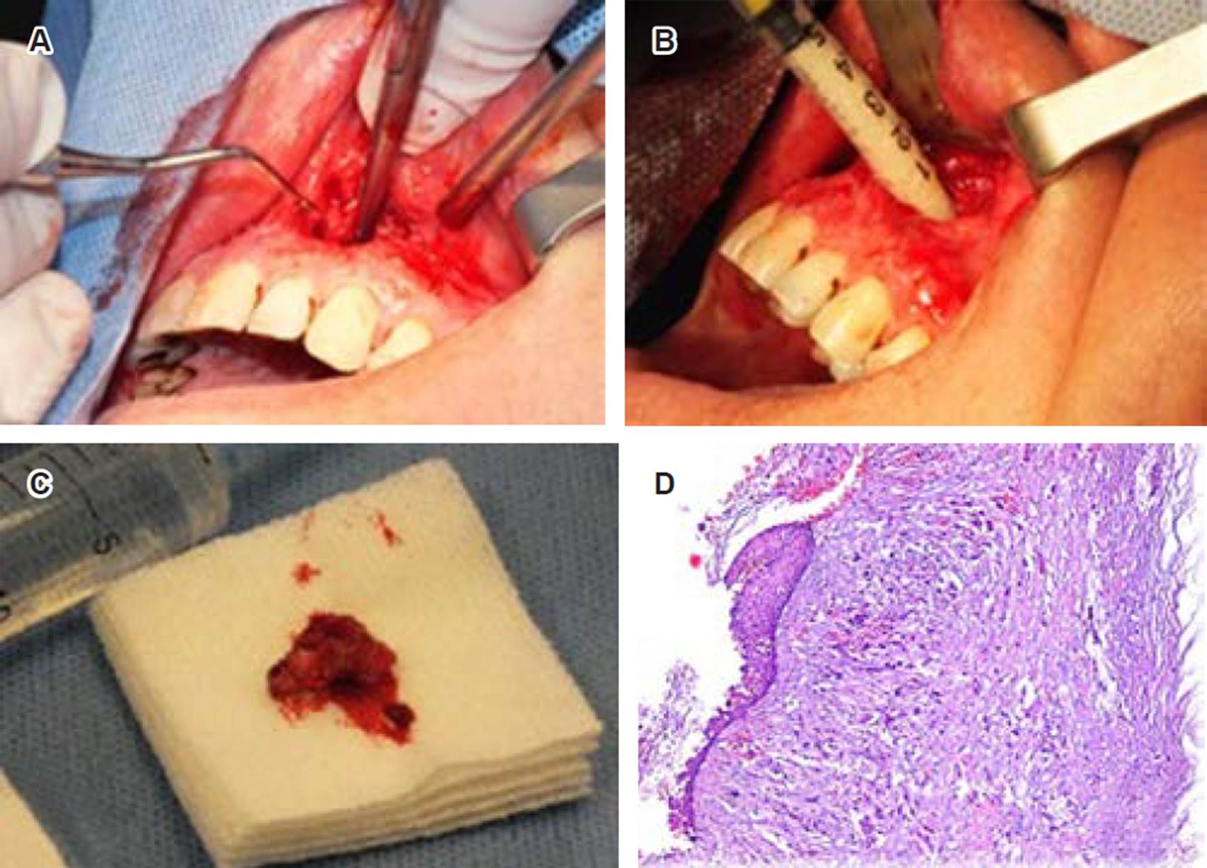 Figura 3 Enucleación de lesión quística. A) Se observa curetaje y remoción de pared quística en maxilar superior. B) Relleno de cavidad con hueso particulado xenogénico. C) Biopsia escisional, se observa muestra de tejido quístico. D) Estudio histopatológico de biopsia escisional teñida con hematoxilina-eosina, aumento 10x. Muestra de membrana quística con revestimiento epitelial escamoso no queratinizado, de pocas capas, y focos de calcificaciones distróficas, con infiltrado inflamatorio crónico en tejido conjuntivo.