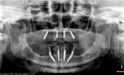 Se extrajeron los dientes remanentes y se colocaron las prótesis inmediatas. Después de seis meses de la maduración del hueso, se elaboraron las guías quirúrgicas permisivas del maxilar y la mandíbula. Se le aplicó anestesia local con vasoconstrictor (Medicaine 1/100,000 (articaine-epinephrine), Septodont Holding, Saint-Maur-des-Fossés, Francia) en ambas arcadas, se hizo una meseta en la parte anterior de la mandíbula para que los implantes queden a la misma altura en el reborde alveolar, y se siguió el protocolo de cirugía del fabricante de implantes (Nobel Active® RP, Nobel Biocare Services AG, Kloten, Suiza), cuatro en cada arcada: dos anteriores rectos y dos posteriores inclinados21,22. Los implantes mandibulares recibieron pilares transmucosos (Multi-unit abutment, Nobel Biocare Services AG, Kloten, Suiza): 2 anteriores rectos y 2 posteriores de 17° con un torque de 35 Newtons para corregir la angulación de los implantes y hacer la conversión de la dentadura inmediata a una prótesis total fija atornillada. A los dos meses de la cirugía, se colocaron los pilares transmucosos del maxilar: 2 anteriores rectos y 2 posteriores de 17° (Figura 2).