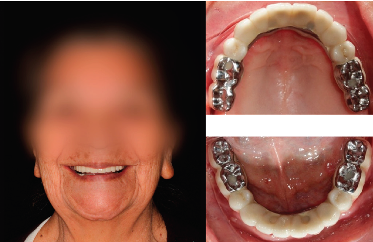 Con el fresado de las prótesis se logró un mejor ajuste pasivo en las conexiones y se evitó la formación de las burbujas que ocasiona el colado, así como la contracción que deriva en falta de ajuste pasivo. Cuando la paciente sonríe, se observa que las caras oclusales metálicas son imperceptibles (Figura 4). Con las caras oclusales metálicas se pretende mantener la dimensión vertical a largo plazo y reducir la delaminación de la porcelana.