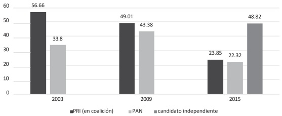 Las condiciones en que una candidatura independiente ganó a la estructura de poder bipartidista en el estado han sido motivo de estudio reciente por parte de los especialistas, pero por objetivos del estudio no nos detendremos a revisar, ya que bien pueden ampliarse el tema con otros estudios (Berumen y Medellín, 2015; Montero, 2017; Hernández, 2017; Atilano, 2021, pp. 101-148). No obstante, para el análisis resulta significativo los bajos niveles de votación tanto del PRI como del PAN en las hoy históricas votaciones del 2015 donde redujeron a casi la mitad sus niveles de votación.