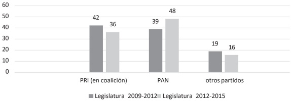 Como se muestra en la gráfica 3, en la legislatura 2009-2012 contó el PRI con 22 diputados (42%), Acción Nacional 17 diputados (39%) y el resto de los partidos minoritarios Nueva Alianza, Partido del Trabajo, PVEM y PRD sumaron 19%. De nuevo a mitad de la legislatura se verifica gobierno dividido al perder la mayoría priista. Es decir, en la legislatura 2012-2015 se tiene una mayoría panista con 20 diputados (48%), el PRI con 15 diputados (37%) y el resto de las fuerzas minoritarias PRD, PT y Nueva Alianza, en conjunto tienen el 21%.