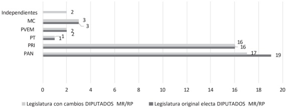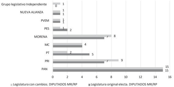 De nuevo, el PRI y el PAN están en la cúspide de la votación electoral. El Partido Acción Nacional consiguió un total de 19 puestos dentro del Congreso, mientras que el Partido Revolucionario Institucional logró 16. Pero el día en que inicia la legislatura, dos diputados del PAN dejan su partido y por ende su grupo legislativo, creando lo que ellos mismos llamaban «diputados independientes», aludiendo a un intento de buscar cercanía con el gobernador, más que a una posición políticamente autónoma. Ambos diputados electos tenían más de 15 años de militancia panista, pero con su salida se anuló la mayoría legislativa de la bancada albiazul. Con este cambio, la reconfiguración legislativa sería la siguiente: 17 diputados del PAN, 16 del PRI, tres de Movimiento Ciudadano, dos del Partido Verde y los dos independientes, mientras que PT y Nueva Alianza mantenían cada uno un solo diputado. En la gráfica 4 se exponen los datos de integración de las bancadas antes y después del cambio.