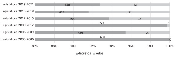 Si en las legislaturas 2003-2006, 2006-2009, 2009-2012 y 2012-2015 prevaleció el escenario 3, en las legislaturas 2015-2018 y 2018-2021, sin los amarres de acuerdos legislativos necesarios, prevaleció el escenario 2 y en menor medida el escenario 3. La tabla 2 muestra este comportamiento legislativo en relación con el veto.