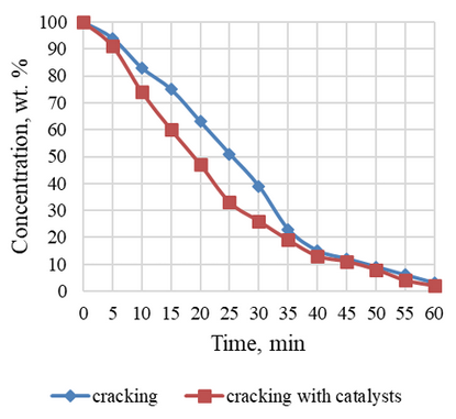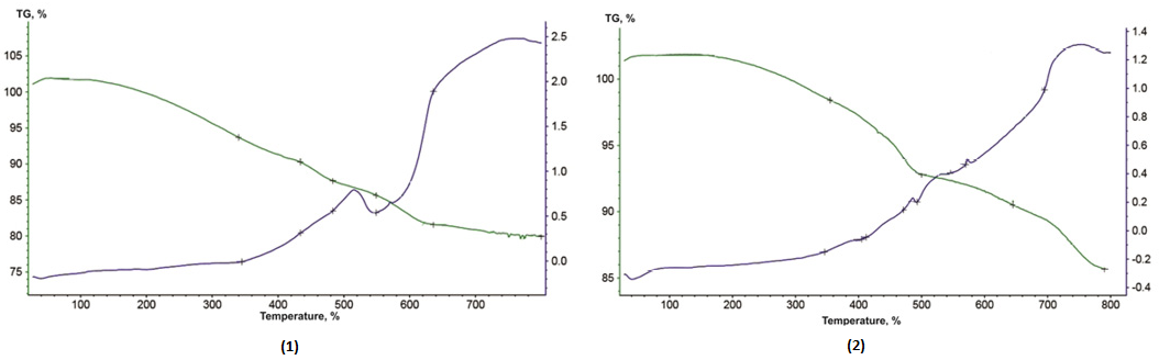 Thermogravimetric analysis of cracking products carried out in an atmosphere of air on a MOM derivatograph (Hungary), which makes it possible to measure the weight loss of an analytical test sample with increasing the temperature to 1000 °С at a heating rate of 10 °С/min. After analysis, derivatograph cleaned with argon as inert gas.