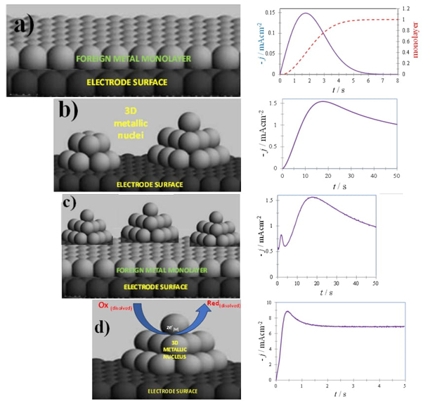 Fig. 1 Schemes, left, and its corresponding potentiostatic current density transient, right, of (a) a 2D monolayer of a metal onto a different nature substrate (b) 3D nuclei electrodeposited onto a foreign nature electrode (c) 2D-3D transition, growth mode called Stranski-Krastanov [65] and (d) a concomitant faradaic reaction occurring on the growing surfaces of a 3D nucleus electrodeposited onto a foreign substrate.