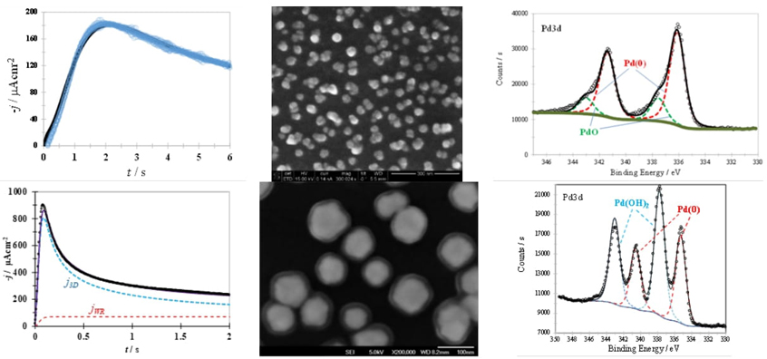 Fig. 2 (a) and 2(b) show that the theoretical current density transient fits the experimental data quite well in both cases Furthermore, this formalism indicates that while j WR is absent when ethaline was used at room temperature, it is clearly present during the PdNPs formation from reline. Therefore, based on this analysis, it is expected that PdNPs formed from ethaline would consist of metallic palladium (see R2), while those formed from reline, due to the present of R1, would lead to the formation of core-sell nanoparticles, Pd@Pd(OH)2, through an E R2 E R1 C R3 mechanisms. In this mechanism, the first electrochemical reaction, E R2 , corresponds to R2, the second, E R1 , to R1 and the chemical reaction, C R3 , to R3, which involves the formation of palladium hydroxide, Pd(OH)2(s), by the reaction of Pd(II) ions in reline with OH- ions formed on the surfaces of Pd(s) nanoparticles. The formation of PdNPs or Pd@Pd(OH)2 are clearly supported by the SEM images and XPS spectra presented in Fig. 2 (a) and 2(b) respectively.
