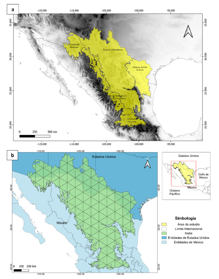 El área de estudio son los pastizales semiáridos que se extienden a lo largo del Desierto Chihuahuense en EUA y México, destacando que estos pastizales varían considerablemente en la composición de pastos nativos (González-Medrano, 2012). Además, en esta región se ha registrado la presencia de diversas especies de aves de pastizal residentes y migratorias (Levandoski y Panjabi, 2014; Ruvalcaba-Ortega y Panjabi, 2018; Vickery et al., 1999). La delimitación del área de estudio (Fig. 1a) se estableció utilizando el sistema de información geográfica QGis 3.16, a partir de la unión de los polígonos correspondientes a las ecorregiones de la CCA (Comisión de Cooperación Ambiental) extraídas del mapa de la North American Terrestrial Ecoregions-Level III (Wiken et al., 2011): 1) Archipiélago Madrense, 2) Desierto Chihuahuense, 3) Planicies del Sur de Texas, 4) Pie de Monte Sierra Madre Occidental y 5) Altiplanicie Mexicana (Fig. 1a). Estas ecorregiones fueron elegidas por la presencia de pastizales naturales y son consideradas como los pastizales cálidos de Norteamérica (Brown y Makings, 2014).