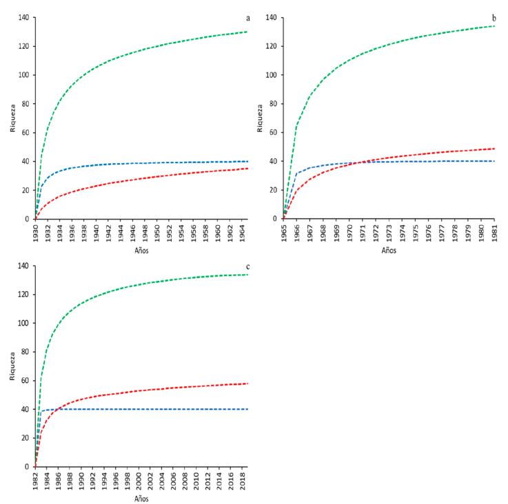 Figura 2 Curvas de acumulación de especies de aves de pastizal (azul), pastos nativos (verde) y pastos no nativos (rojo) para los periodos de a) 1930-1964, b) 1965-1981 y c) 1982-2019.