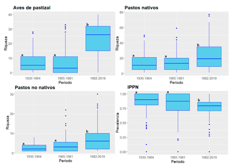 Figura 3 Diagramas de caja de la riqueza de aves de pastizal, pastos nativos, pastos no nativos y el índice de prevalencia de pastos nativos (IPPN) para cada periodo. Periodos identificados con letras diferentes indican diferencias significativas (p ≤ 0.0166) con el resto a partir de pruebas “post-hoc” de Wilcoxon (ver detalles en Materiales y métodos).