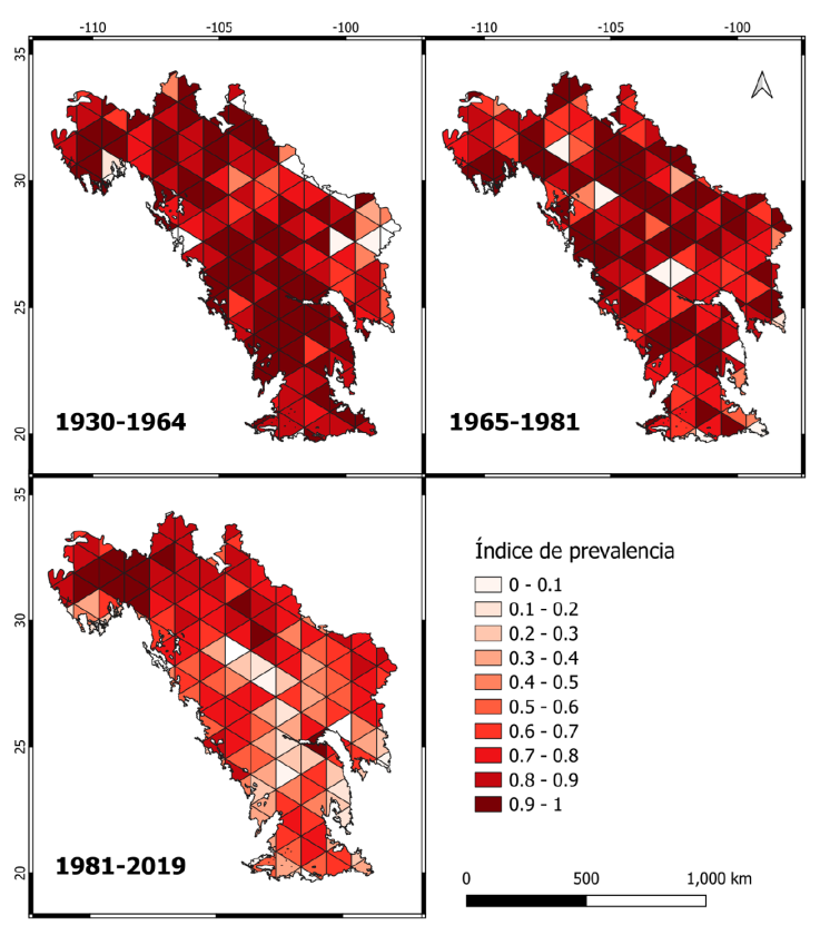 Estas etapas en el país enmarcan el tiempo en que la presión antropogénica pudo ser relevante para favorecer la introducción y expansión de pastos no nativos dentro del Desierto Chihuahuense, sobre todo porque estas especies de pastos, una vez establecidas, se expandieron con el tiempo ampliando su área de distribución geográfica (Guo et al., 2006). Comprender la dinámica temporal de cambio en la biodiversidad vegetal sobre las especies nativas es crucial para las estrategias de conservación a una escala regional. Estos cambios se han abordado a través de análisis de la diversidad beta (Qian, 2008; Qian y Ricklefs, 2006), entendida como los cambios en la composición de especies en ámbitos espacial, temporal y ambiental (Calderón-Patrón y Moreno, 2019).