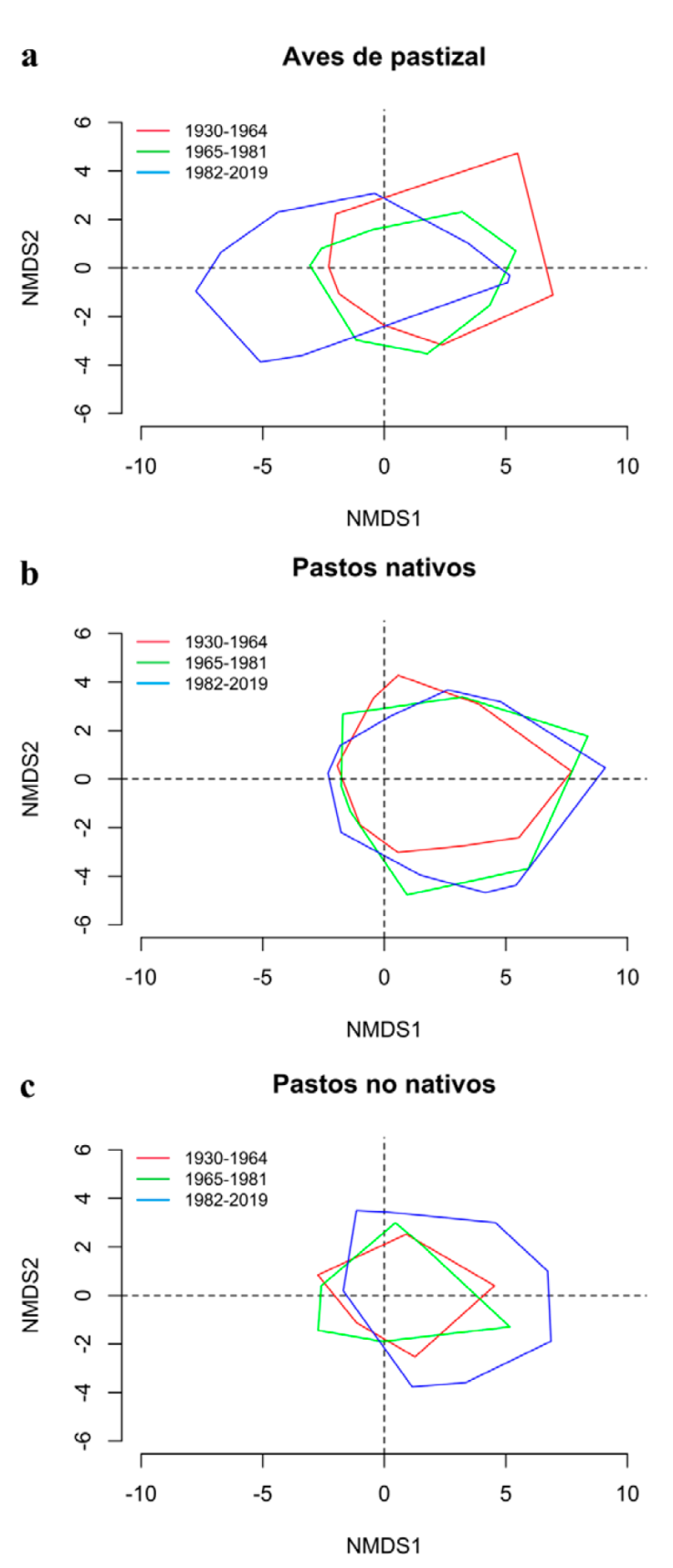 Finalmente, los NMDS revelaron una variación en la composición y riqueza regional del ensamble de especies tanto de aves como de pastos nativos y no nativos entre los periodos estudiados (Fig. 5). Se observó una discontinuidad en la composición de especies de aves de pastizal a lo largo del tiempo, con una marcada contracción durante el periodo de 1965-1981 y una distribución más dispersa en el periodo de 1982-2019, indicando cambios abruptos en la estructura del ensamble (Fig. 5a). En contraste, se observó un cambio gradual en la composición de especies de pastos nativos, con un incremento en la distribución del ensamble en varios sitios de la región con una posible contracción entre periodos (Fig. 5b). Por último, se observó un marcado aumento en la composición del ensamble de pastos no nativos, especialmente notable durante el periodo de 1982-2019 (Fig. 5c). Este patrón de cambio confirma la expansión significativa del ensamble de pastos no nativos en comparación con los periodos anteriores, en el mismo sentido que la proyección del IPPN para el último periodo (Fig. 4). Estos resultados sugieren que el periodo de 1982-2019 muestra cambios en el ensamble de especies respecto a los otros periodos en términos del IPPN y la riqueza de especies. Sin embargo, esta tendencia no se mantuvo de manera consistente en el último periodo.