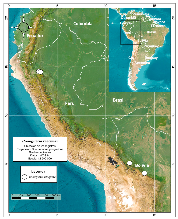 La escasez de registros de R. vasquezii parece sugerir que se trata de una especie poco común. Sin embargo, las localidades conocidas en Bolivia y Perú distan entre sí aproximadamente 1,600 kilómetros en línea recta y las áreas intermedias de la Cordillera Oriental de los Andes tienen amplias extensiones de hábitats potencialmente adecuados para esta especie, que en gran medida no han sido exploradas botánicamente (Fig. 1). Por otra parte, las plantas de R. vasquezii, como otras orquídeas epífitas de ramitas de la subtribu Oncidiinae, tienen la capacidad de establecerse tanto en árboles nativos como introducidos en áreas sujetas a diferentes grados de disturbio. La talla reducida de las plantas hace difícil localizarlas entre los musgos en las ramas de sus forófitos, pasando fácilmente desapercibidas para colectores no especialistas. Por lo tanto, es probable que la escasez de registros represente una falta de recolecta en la extensa, topográficamente compleja y relativamente inaccesible vertiente amazónica de la Cordillera Oriental de los Andes. Se sugiere la categoría “Datos insuficientes” (DD; UICN, 2019) mientras no haya estudios que evalúen objetivamente el estatus de riesgo de esta especie.