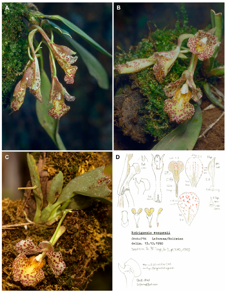 Los autores agradecen el apoyo financiero del Fondo Nacional de Desarrollo Científico y Tecnológico del gobierno peruano al proyecto “Diversidad de las Orchidaceae en el bosque montano del Área de Conservación Privada La Pampa del Burro: integrando la taxonomía tradicional y el código de barras de DNA” (contrato Núm. 058-2021- FONDECYT); al Servicio Nacional de Áreas Naturales Protegidas por el Estado (SERNANP) y el Servicio Nacional Forestal y de Fauna Silvestre (SERFOR) del Perú por las autorizaciones para colecta científica (Núm. 006-2018-SERNANP-BPAM-JBPAM y Núm. AUT-IFL-2021-033-SERFOR, respectivamente); a la comunidad de Perla del Imaza por su apoyo para llevar a cabo el trabajo de campo en el Área de Conservación Privada La Pampa del Burro; a Ivonne Paico Vera, Jefa del Bosque de Protección Alto Mayo, por permitir el acceso al área protegida y apoyar la obtención de la autorización de colecta; a Jorge Alcántara, guardaparque del puesto de control Venceremos del Bosque de Protección Alto Mayo, por su apoyo durante el trabajo de campo; a Irene Bock y Olaf Gruss por su ayuda para obtener literatura; a Jay Pfahl y Andreas Franzke (curador del Botanischer Garten Universität Heidelberg) por información sobre fotografías e ilustraciones de R. vasquezii; a Laura Márquez y Nelly López (LaNaBio) por el apoyo técnico para la secuenciación de DNA; a los curadores de AMES, AMO, BAS, CUZ, GH, HEID, HOXA, K, KUELAP, LPB, M, MEXU, MO, NY, QCE, QCNE, SEL, US, USM por las facilidades para acceder a las colecciones a su cargo, especialmente a Lauren Rogers (MO), Mónica Moraes (LPB) y Bruce Holst (SEL) por su ayuda en localización del material tipo de R. vasquezii y la autorización para reproducir la imagen digital del ejemplar en SEL; a Iván Jiménez por la información proporcionada sobre el material de Roberto Vásquez en LPB; a María Isabel Vásquez por la autorización para reproducir la ilustración original de Rodriguezia vasquezii; a Germán Carnevali, Rodolfo Solano y Lourdes Rico por sus sugerencias constructivas a versiones previas del manuscrito. JDE agradece a CONCYTEC - PROCIENCIA, Programa de Doctorado en Ciencias para el Desarrollo Sustentable (contrato Núm. PE501093193-2024-PROCIENCIA-BM). JPA agradece a CONCYTEC- PROCIENCIA, Programa de Doctorado en Ciencias para el Desarrollo Sustentable (contrato Núm. PE501088645-2024-PROCIENCIA-BM).