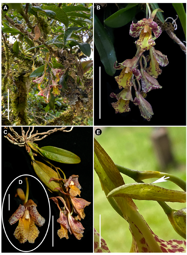 Figura 3 Rodriguezia vasquezii. A, Planta en su hábitat en el puesto de control Venceremos del Bosque de Protección Alto Mayo, Departamento de San Martín, Perú; B, acercamiento de la inflorescencia; C, planta del paraje Río Rojo del Área de Conservación Privada La Pampa del Burro, departamento de Amazonas, Perú; D, acercamiento de una flor; E, fotografía con iluminación al trasluz del tubo formado por los sépalos laterales de una flor, mostrando la presencia de néctar (flecha). Escalas: A, B = 5 cm; C = 3 cm; D, E = 1 cm.