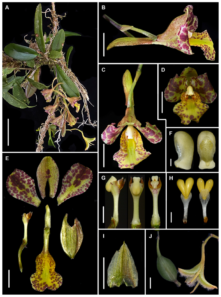 Figura 4 Rodriguezia vasquezii. A, Planta en floración; B, flor, vista lateral; C, flor, vista dorsal; D, flor, vista frontal; E, disección floral; F, antera, vista lateral (izquierda) y ventral (derecha); G, de izquierda a derecha, columna en vista lateral, dorsal y ventral; H, polinario, vista dorsal (izquierda) y ventral (derecha); I, bráctea floral extendida; J, cápsula antes de la dehiscencia (izquierda) y en plena dehiscencia (derecha). Escalas: A = 5 cm; B-E, J = 1 cm; F, H = 1 mm; G, I = 5 mm.