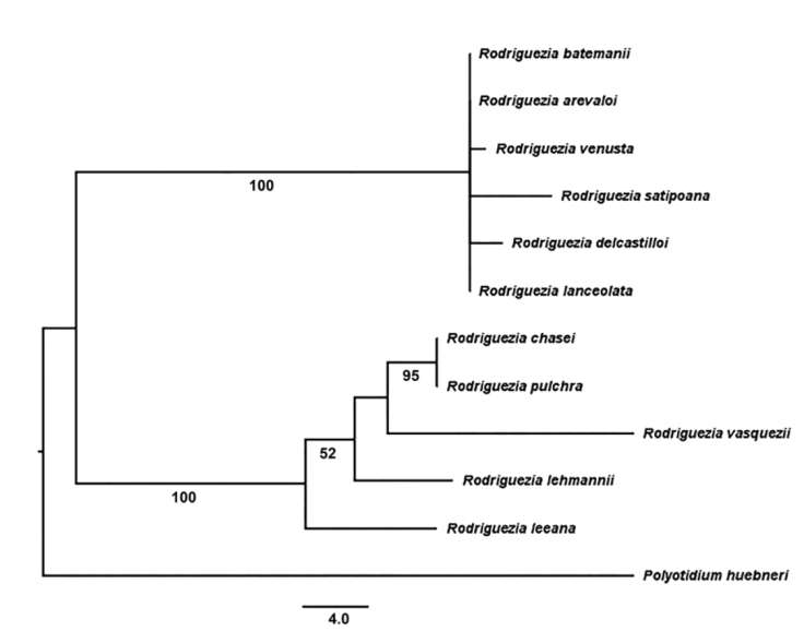 Análisis filogenético. La matriz alineada consistió en 12 taxones y 1,550 caracteres, de los que 777 correspondieron a la región ITS y 773 al fragmento de matK. Un total de 48 caracteres fueron informativos para la parsimonia. El análisis recuperó un solo árbol máximamente parsimonioso (Fig. 6), con una longitud de 115 pasos, CI (excluyendo caracteres no informativos) = 0.84 y RI = 0.95. Dentro de Rodriguezia se recuperaron 2 clados principales con fuerte apoyo bootstrap (BP = 100); uno de ellos consiste en una politomía que incluye a R. lanceolata, R. delcastilloi D.E. Benn. et Christenson, R. satipoana, R. venusta (Lindl.) Rchb.f., R. arevaloi Schltr. y R. batemanii. El otro clado principal incluye a R. leeana Rchb.f. como hermana de un agrupamiento con apoyo marginal (BP = 52) consistente en R. lehmannii Rchb.f. y R. vasquezii como hermanas sucesivas del par de especies fuertemente apoyado (BP = 95) formado por R. pulchra y R. chasei.