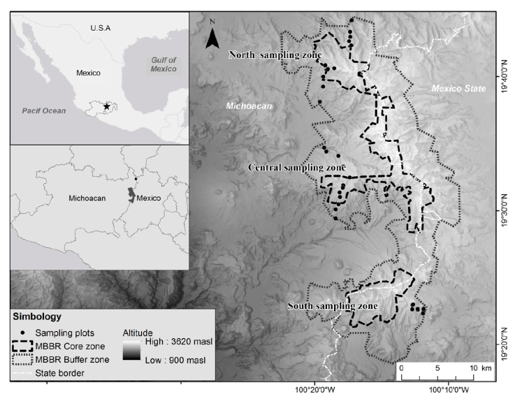 We conducted this study in the Monarch Butterfly Biosphere Reserve (MBBR), located between Estado de México and Michoacán, Mexico (19°44’27” and 19°18’32” N, 100°22’26” and 100°09’07” W). The MBBR covers 5.63 × 103 ha, divided into 3 core zones (with a total area of 1.36 × 103 ha) and 2 buffer zones (with a total area of 4.27 × 103 ha; Conanp, 2001; Fig. 1). Seventy-seven percent of the MBBR area consists of mountains and hills, while the rest consists of small valleys. Eighty percent of the area belongs to 59 ejidos (a form of communal land ownership) and 13 indigenous communities, while the rest belongs to the federal or state governments (Conanp, 2001).