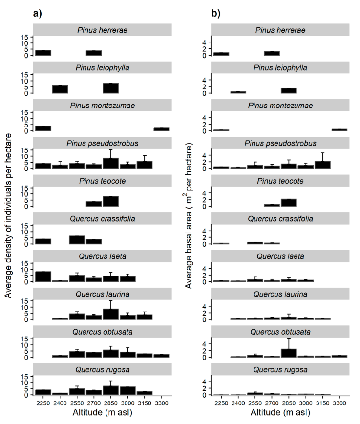 Pine and oak species abundance and distribution. We measured 749 individuals on 10.4 ha; 466 individuals belonged to the genus Pinus, 423 individuals (91%) were Pinus pseudostrobus and the rest of the pine species had only 9% of the individuals (Table 1). The remaining 283 individuals belonged to the genus Quercus; 155 were Quercus laurina Bonpl, the rest 128 were from the other 4 species (Table 1). The individuals belonged to 10 species, 5 in each genus. Pinus pseudostrobus and Quercus laurina had the largest distribution ranges, the highest number of individuals, and the largest basal area (Fig. 2a, b). We recorded P. pseudostrubus and Q. laurina at most points along the altitudinal gradient and on the northern and southern slopes. Q. laurina showed the highest density values at 2,850 m. Pinus herrerae Martínez and Pinus leiophylla Schiede ex Schltdl. & Cham showed disjunct ranges, being absent at most elevations of the altitudinal gradient. Similarly, Pinus montezumae Lamb. was recorded at the lowest (2,250) and highest (3,330) elevations, but not at the intermediate elevations (Fig. 2a). Two pine species, P. leiophylla, and P. montezumae, were recorded only on south-facing slopes (Table 1). We did not find clear patterns of pine and oak being associated with a particular elevation range.