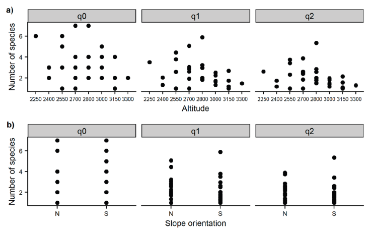 Alpha diversity. According to the sample coverage analysis, the samples in the plots were equally complete, with values above 90% (Appendix). The species richness per ha did not differ significantly between the northern and southern slopes (F1, 30 = 0.25, p > 0.05). On the other hand, none of the diversity orders analyzed (q0, q1, q2) showed a defined distribution pattern, either hump-shaped or with a monotonic decrease (Fig. 4a, b). Diversity orders q0 (F1, 29 = 0. 46, p > 0.05) and q1 (F1, 29 = 0.16, p > 0.05) were not explained by altitudinal gradient. However, order q2, which focuses on dominant species, was associated with the altitudinal gradient (F1, 29 = 0.56, p = 0.001), showing higher dominance at higher and lower altitudinal points (Fig. 4a). The area of the sampled point did not influence the diversity patterns found (F1, 28 = 0.02, p > 0.05).
