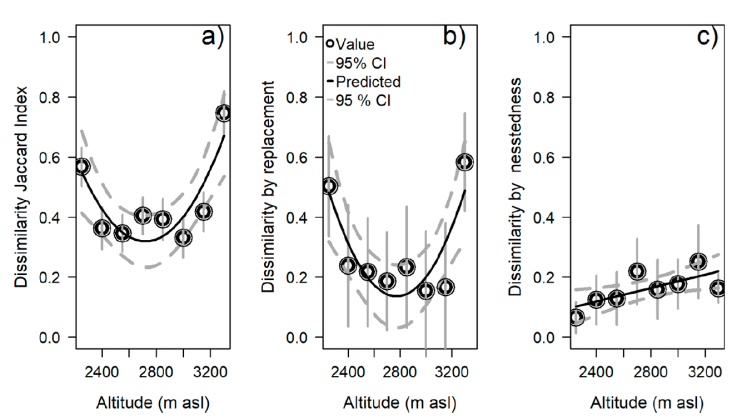 Figure 5 Beta diversity of pines and oaks across the elevation gradient in the MBBR: a, species dissimilarity including species turnover and nesting; b) dissimilarity associated with species turnover only across the elevation gradient; c) dissimilarity associated with species nesting only across the elevation gradient.
