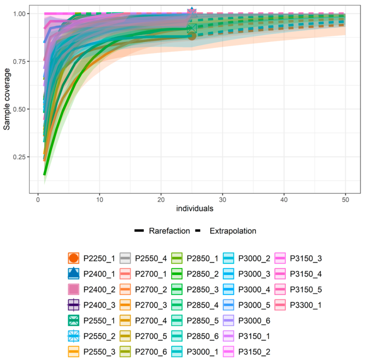 To conduct diversity analyses, we first ensured that the sampling effort at each point was adequate by estimating sample coverage with upper and lower 95% confidence intervals to validate the alpha diversity comparisons we made (Chao & Jost, 2012: Chao et al., 2020, 2023). With this standardized approach, it is possible to quantify, estimate, and compare richness between communities, even if the sampling points are of different sizes (Chao et al., 2020, 2023; Moreno, et al., 2011). We then estimated alpha diversity at points of elevation and slope orientation as a function of species abundance distribution. We used Hill’s numbers (Hsieh et al., 2016; MacArthur, 1972), which analyze 3 orders of diversity. The first order (q0) estimates species richness or the number of species per unit area; the second order (q1; equivalent to the exponential of Shannon’s diversity index) estimates the number of common species; the third order (q2; equivalent to the inverse of Simpson’s diversity index) counts the number of dominant species. To perform this analysis, we used the iNEXT package (Hsieh et al., 2016). We conducted an analysis to determine if the area of the sampling point influenced the species diversity recorded. We estimated alpha diversity per hectare and determined its correlation with altitudinal gradient and slope orientation. We also analyzed whether the altitudinal gradient explained the order of diversity (q0, q1, q2). For all these analyses, we used second-order generalized linear models (GLMs) with gamma distributions (Venables & Ripley, 2002) in the open- source R software 4.3.2 (R Core Team, 2023). Next, we computed the average dissimilitude, turnover, and nesting of species along the altitudinal gradient to estimate beta diversity using the Jaccard index for every sampling plot. The standardized number of individuals recorded across the elevation gradient allows us to compare sampling sites even if we have different areas. Finally, we evaluated whether the elevation influences the average species turnover and nesting through a first and second-order linear model. We used the open- source R software (version 4.3.2) program to perform all analyses.