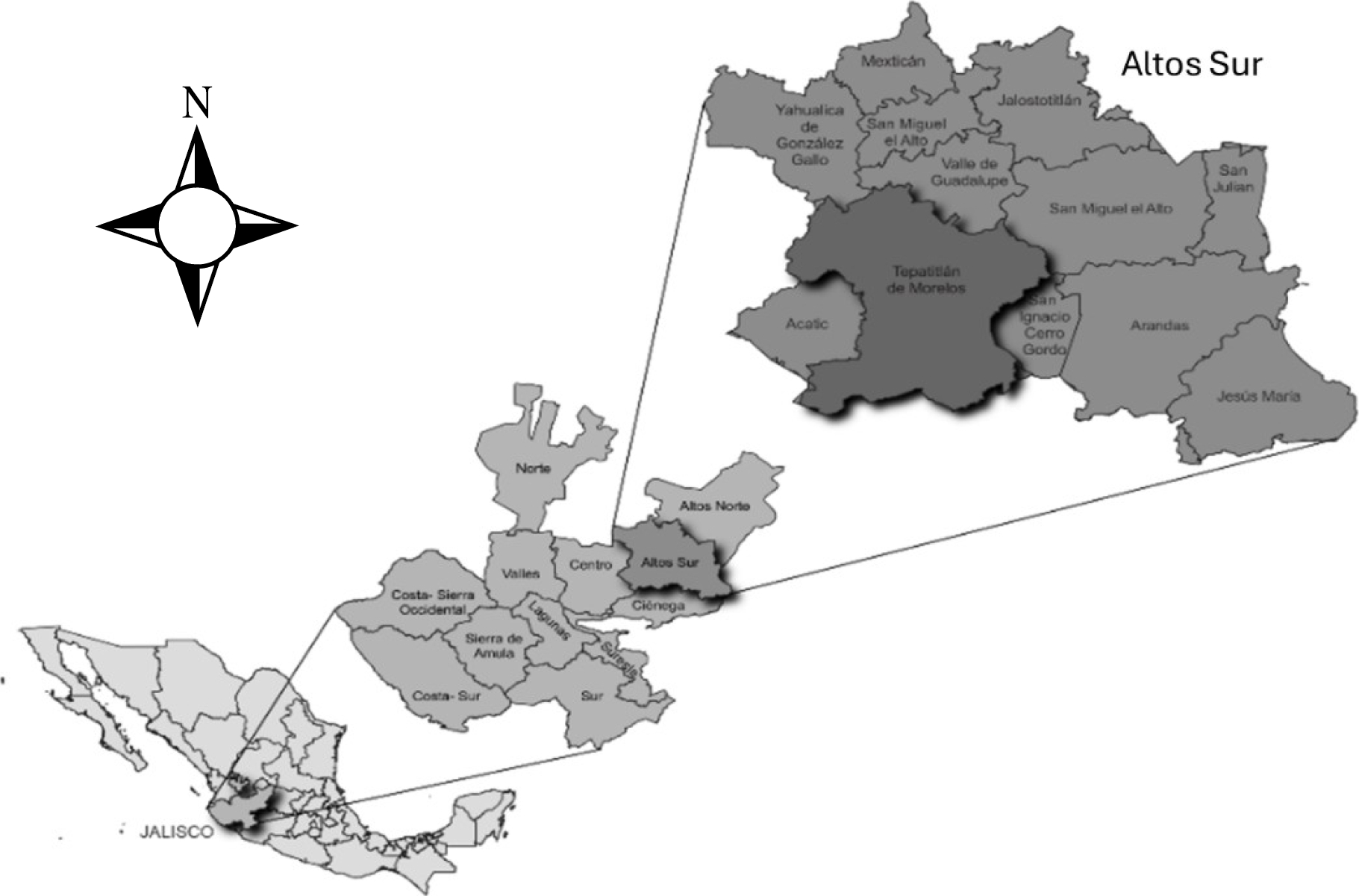 El estudio, se realizó en el municipio de Tepatitlán de Morelos, Jalisco, ubicado en los paralelos 20°35’ y 21°03’ de latitud norte, los meridianos 102°28’ y 102°57’ de longitud oeste y una altitud entre 1,300 y 2,600 msnm (Figura 1). Este municipio, pertenece a la región conocida como Altos Sur y tiene un clima templado subhúmedo, con un rango de temperatura de 16 a 22°C y precipitación de 700 a 1,100 mm (INEGI, 2010; Castañeda et al., 2014).