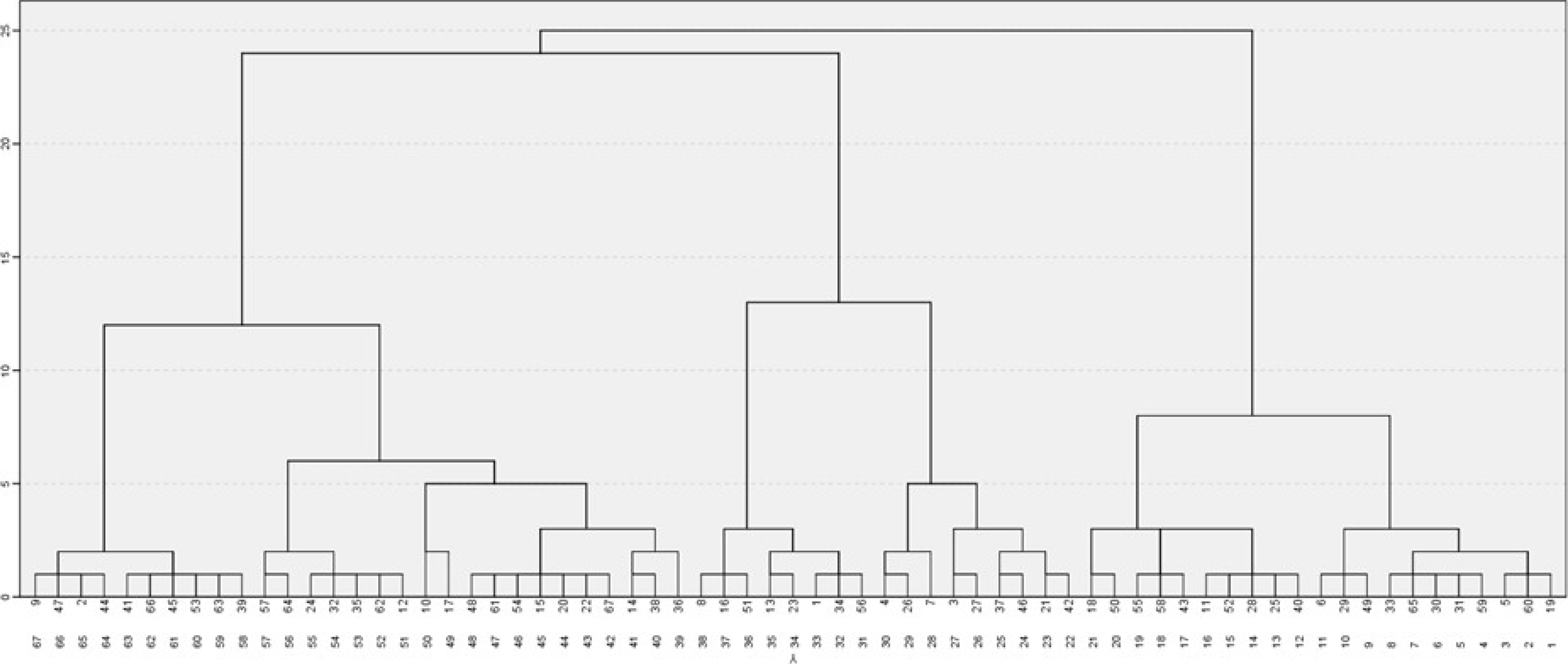Con el AC, utilizando el método jerárquico, se identificaron tres grupos (Figura 2). Esta información, fue considerada para realizar la tipificación de los productores de maíz mediante el método de K-medias, donde se clasificaron los productores en tres grupos. Con el AD, se comprobó la bondad de la clasificación y se determinó que todos los encuestados, fueron clasificados de forma correcta y válida. La interpretación del valor del estadístico lambda de Wilks de 0.104, valor cercano a cero, indica que los grupos formados, fueron estadísticamente diferentes. De acuerdo con este valor y el estadístico F, los cuatro factores considerados en la clasificación, contribuyeron a la discriminación de grupos por su nivel de p<0.05 y un valor de F mayor a 3.84.