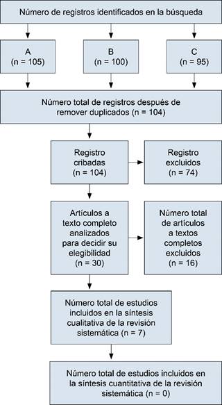 Figura 1: Esquema tipo STROBE que se utilizó para esta revisión sistemática. Búsqueda A con 105, búsqueda B con 100 y búsqueda C con 95.