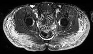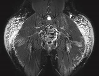Figura 1: Resonancia magnética regiones glúteas. Axial STIR. Imágenes globulares y lineales con infiltración de los músculos glúteos mayores y medios compatibles con modelantes.