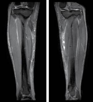 En el estudio de resonancia magnética (RM) de piernas se identificó edema de tejidos blandos superficiales de ambas piernas con depósitos de material modelante en la porción superior del músculo gemelo medial de la pierna derecha y en la pierna izquierda se observa material modelante en toda su longitud sin compromiso de los planos musculares (Figura 3).