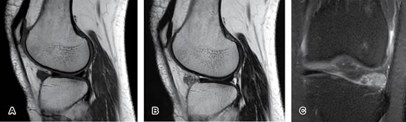 Figura 1: Resonancia magnética de rodilla izquierda. A) Sagital T1. B) Sagital T2. C) Coronal en DP FS. Imagen nodular intraarticular anterior al cuerno anterior del menisco lateral, de comportamiento isointenso en T1, heterogéneo con señal intermedia-alta en T2 e hiperintenso en DPFS, con ausencia de efecto de masa.