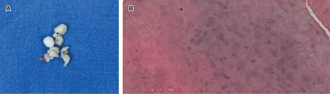 Mujer de 55 años de edad, refiere caída de su propia altura sobre rodilla izquierda presentando dolor moderado en la región anterolateral y limitación funcional, como único antecedente: múltiples microtraumatismos previos en rodilla. Se le solicita resonancia magnética simple (Figura 1) identificando imagen característica de condromatosis sinovial, después se realiza artroscopia con resección de fragmentos condrales libres (Figura 2), sin observar cambios en tejido sinovial y se envían a patología, confirmando la alteración (Figura 3).
