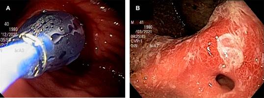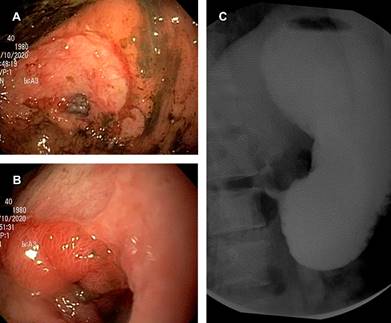 Los laboratorios mostraron anemia hipocrómica microcítica grado II y antígeno carcinoembrionario 0.96 ng/mL. Se efectuaron panendoscopias, la inicial (Figura 1A y B), a los 15 días con dilatación, a los dos meses con dilatación y a los tres meses. La inicial mostró zona de ulceración desde la incisura angularis hasta el píloro, con sangrado, sin permitir paso del panendoscopio.