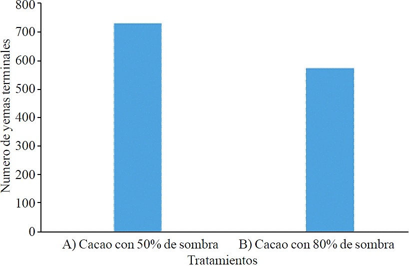 El número de yemas terminales fue mayor en el tratamiento con menor sombra, se contabilizaron 731 yemas, mientras que en el tratamiento con mayor sombra el número fue de 574. En ambos tratamientos las yemas se encontraron localizadas en todo el fuste del árbol de cacao (Figura 4). Las yemas terminales donde hubo una menor penetración de luz, se encontró que éstos surgían en las partes más altas del árbol (arriba de los 20 cm. del suelo) y en donde hubo mayor intercepción de luz, las yemas empezaron a emerger al nivel del suelo.