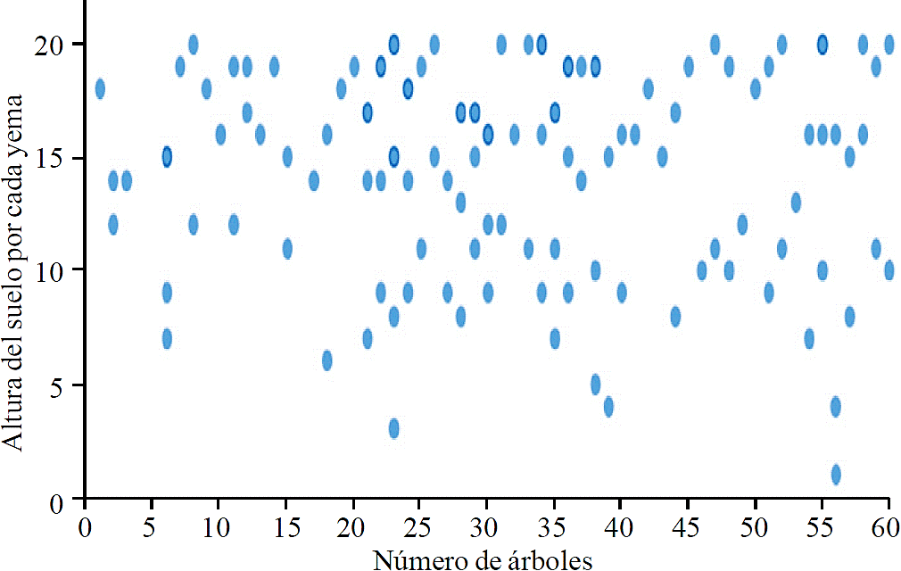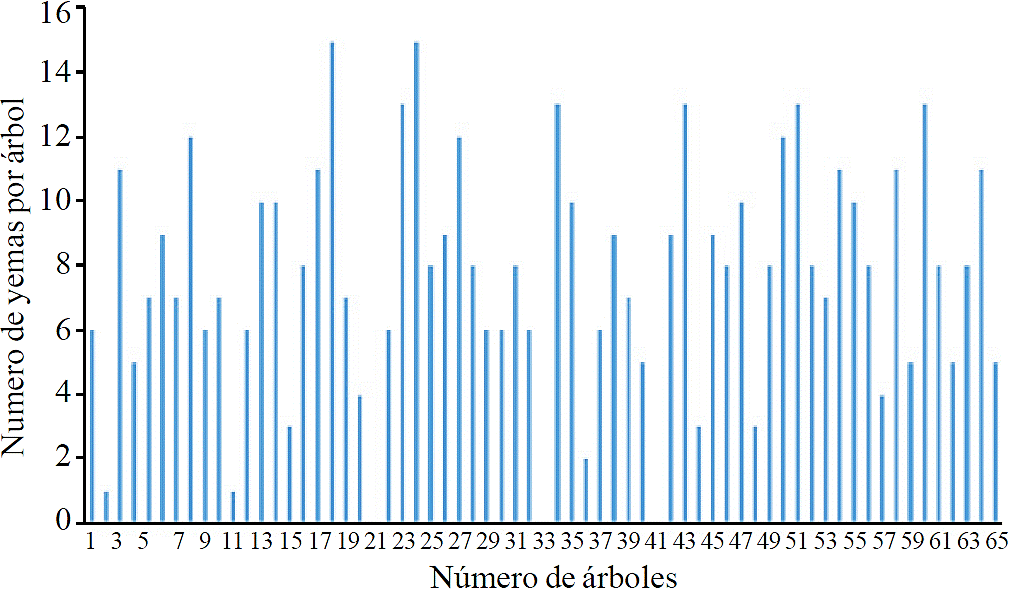 En el tratamiento 1, el mayor número de yemas se encontró en los árboles marcados 18 y 24 con 15 yemas terminales para cada árbol, y el menor número en los árboles 21, 33 y 41 con 0 yemas (Figura 5). En los árboles que no emitieron yemas fue a causa de las termitas (comején) que había en el sitio. El daño resultante viene de que éstas establecen sus nidos en el tronco y cubren partes importantes del área productiva del árbol.
