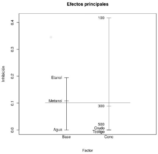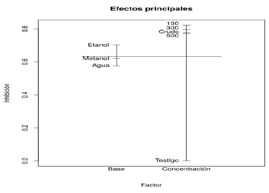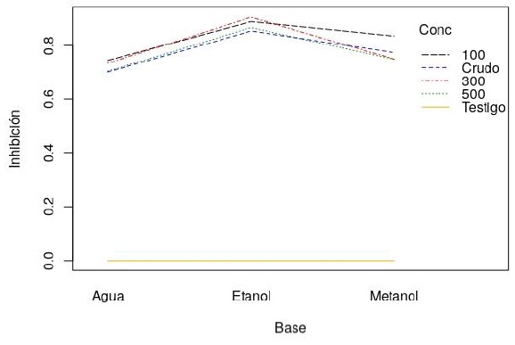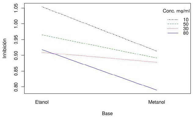 The Anova demonstrated significant differences between the treatments and the data were analyzed in a factorial arrangement, from which two main factors were separated, as extraction base and concentration, as shown in Table 4a and 4b respectively. Highlighting as main groups with the greatest inhibitory effect the ethanol extraction base and the concentration of 100 mg ml-1 corresponding to each of the analyzed factors shown in Figure 6.