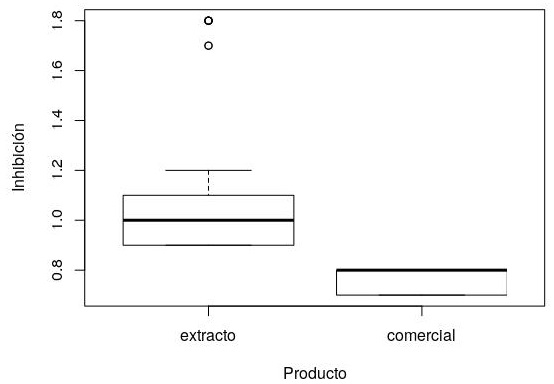 The comparison of plant extract against commercial product was analyzed by non-parametric statistics. The commercial product was compared with the best concentration (10 mg ml-1), based on ethanol, this being the highest inhibition mean. The data were analyzed using Wilcoxon’s ranks sum test (Wilcoxon rank sum test: W=11025, p-value <2.2 e-16), the medians are statistically different.