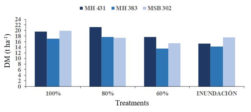 Figure 5 presents the results of the dry matter production of three corn varieties with four irrigation treatments. The variety MSB-302 showed the highest dry matter yield in the treatment of 100% with an approximate production of 20 t ha-1 and the lowest yield was obtained in the treatment of irrigation at 60% with a production of 15.5 t ha-1. The corn variety MH-431, compared to the treatment of irrigation at 80%, showed the highest dry matter yield (21 t ha-1) and the lowest occurred with flood irrigation (15.3 t ha-1). Finally, the variety MH 383 showed its highest yield in the treatment of irrigation at 80% with a production of 17.7 t ha-1 and the lowest was found in the treatment of irrigation at 60% with a production of 13.5 t ha-1.