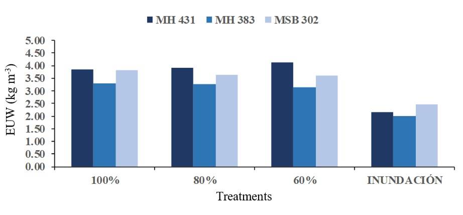 Figure 6 presents the results of the efficiency in the use of water (EUW) obtained from three corn varieties in four irrigation treatments. The variety MH-431, with the treatment of irrigation at 60% ET, obtained the highest EUW (4.12 kg m-3), while the variety MH-383 with the flood irrigation treatment was the lowest (2.01 kg m-3). These results are consistent with those reported in the literature, where greater EUW is obtained in drip irrigation compared to flood irrigation. The highest efficiencies were obtained with the treatments where a lower irrigation sheet was used (60% ET). The variety MH-431 was the one that showed the greatest EUW compared to the other two varieties, since this variety is more tolerant to high temperatures.