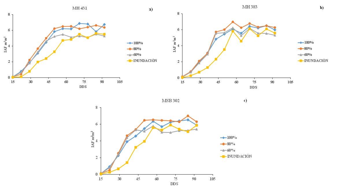 The variety MH-383 was the one that had the least negative value with -0.07 MPa, which remained from 78 to 85 DAS. In Figure 4c with the treatment at 60% ET, the variety MH-431 is seen as the most susceptible to water restriction, having a more critical negative value of -1.93 MPa observed at 71 DAS and at 85 DAS the variety MSB-302 with -1.8 MPa. In the flood irrigation treatment (Figure 4c), the values of water potential have practically the same trend, however, the most critical negative value occurred in the variety MSB-302 with -1.7 MPa at 78 DAS, and the least negative value occurred in the varieties MH-431 and MH-383 with values of -0.95 and -1 MPa, respectively, at 22 DAS.