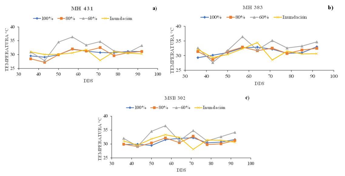Figure 3c with the treatment at 60% ET, the minimum temperature value occurred in the variety MH-383 with 27.67 °C at 43 DAS and the maximum occurred in the variety MSB-302 with 36.58 °C at 53 DAS, this treatment was the one that showed the greatest variability with a value of 8.9 °C between the maximum and minimum readings. The temperature values obtained in the flood irrigation treatment are shown in Figure 3c, where it is observed that the maximum value recorded was in the variety MH-431 with 34.43 °C at 64 DAS, on the contrary, the minimum value observed was in the variety MH-431 with 27.93 °C at 71 DAS. This last value confirms what the literature indicates regarding the variety MH-431, which is a variety tolerant to high temperatures, which is an advantage against the climate of the Comarca Lagunera.