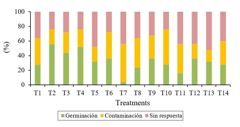 The average germination obtained in the treatments was 32.3% 60 days after the in vitro establishment of the seed. Nevertheless, the highest percentage of germinated seeds (56%) was obtained with the treatment composed of MS culture medium supplemented with 0.5 mg L-1 of BAP (T2), which is consistent with the research developed by Rustaei et al. (2009), who worked with Malus domestica. Because wild donor plants were used in this research, which lacked rigorous health conditions, the disinfection protocol was not as effective in some treatments because there was an average of 31.7% contamination by unidentified fungi and bacteria. This coincides with what is established by Da Câmara et al. (1991); Keresa et al. (2012), who argue that the establishment of plant material depends largely on the phytosanitary care of seed donor plants (Figure 1).