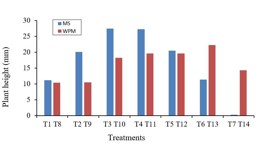 Although the analysis did not show significant differences between culture media, it was observed that plants of different sizes were produced, with the plants with the MS medium showing greater height, with T3 (1.5 mg L-1 of BAP), which obtained an average of 27.59 mm, and T4 (0.5 mg L-1 of IBA) with 27.36 mm (Figure 4) standing out.