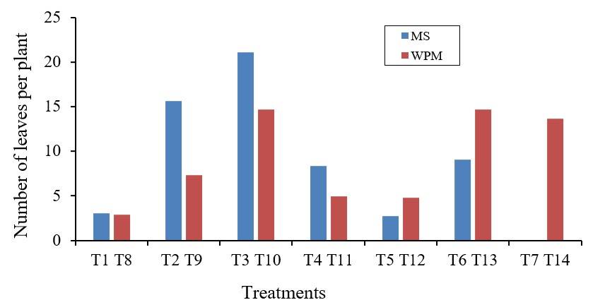 The statistical analysis did not report significant differences (p≥ 0.05) between treatments with respect to this variable according to the Kruskall-Wallis test for nonparametric data. However, it was observed that T3 (MS with 1.5 mg L-1 of BAP) stood out with the best response of leave generation, producing 21.07 leaves on average (Figure 5). A good leaf development increases the possibility of better capturing sunlight, which makes the physiological process of carbohydrate production through photosynthesis more efficient, which will allow their adaptation to the open environment in their acclimatization stage in less time than plants that produce a small number of leaves (Valladares and Niinemets, 2008).
