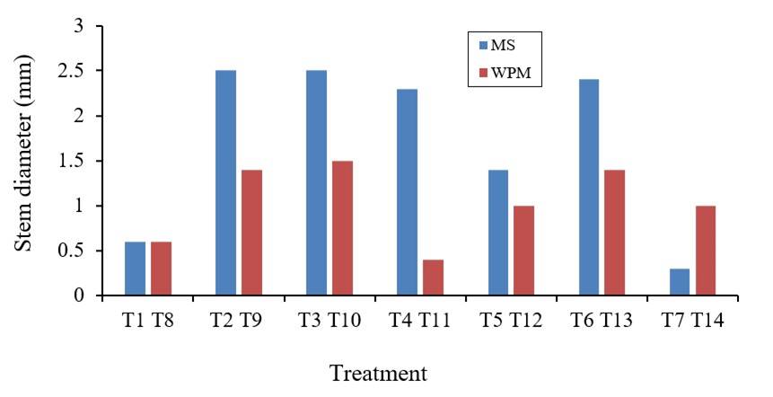 The stem diameter values of the plants obtained at 60 days behaved statistically significantly (p≥ 0.05) between the culture media MS and WPM . T2 (MS with 0.5 mg L-1 of BAP) surpassed the other treatments in this variable, with a mean of 2.5 mm, showing heterogeneity in stem diameter (Figure 6).