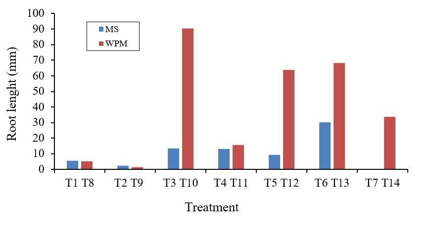 Figure 8 Root length of M. domestica plants produced in vitro in two culture media and different doses of growth regulators.