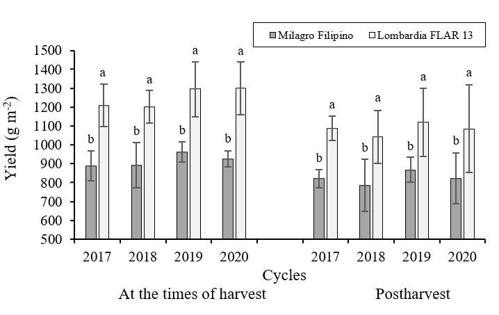 For the variable yield per area at the time of harvest, the statistical analysis detected significant differences in the four evaluation cycles (Figure 1). The Lombardía FLAR 13 treatment exceeded the Milagro Filipino treatment by more than 333 g m-2 on average of the evaluation cycles. Thus, the Lombardía FLAR 13 treatment showed values higher than 1 250 g m-2 average in the evaluation cycles (Figure 1).