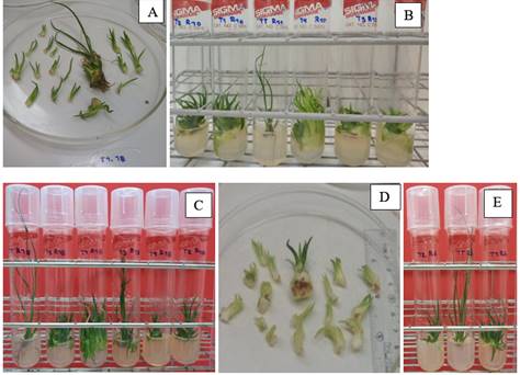 Figure 1 A) separation of shoots to establish SC3; B) repetition 10 from left to right (1, 0.5, 2, 2.5, and 1.5 mg L-1 BAP), SC3; C) repetition 18 of the treatments from left to right (0, 2.5, 0.5, 1.5, 2, and 1 mg L-1 BAP) SC4; D) shoots with IHH, generated in SC3; and E) SC4-1 treatments R6 treatments from left to right (1, 0, and 0.5 mg L-1 BAP) SC4-1.