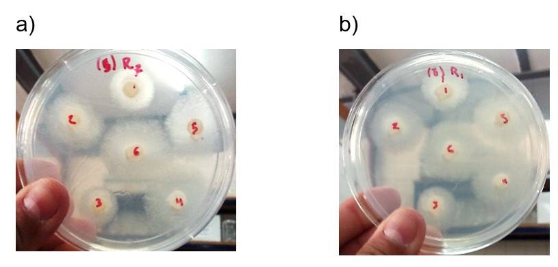 Figure 1 Effect of leaf dichloromethanolic/hexane extracts (T4 disc 3) on mycelial growth in P. chrysosporium at 72 h (a). Defatted hexanic extract (T2 disc 2) (b). Discs 6 (S/treatment), disc 1 (fungicide) for all experiments.