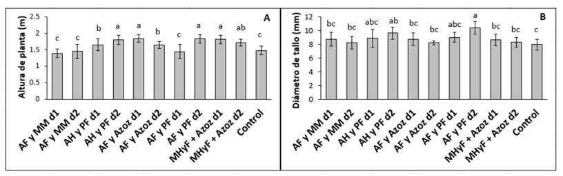 Figura 1 Altura de planta (A) y diámetro basal de tallo (B) en frambuesa con aplicaciones de sustancias húmicas y rizobacterias. Letras diferentes entre barras indican diferencias significativas entre tratamientos LSD de Fisher (p≤ 0.05).